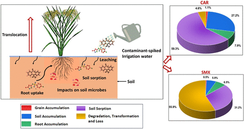 Image: ACS ES&T Water - "Can Contaminated Irrigation Water Drive Pharmaceutical Uptake and Transformation in Rice Paddy? Unveiling Pathways, Natural Attenuation Mechanisms, and Health Risk Assessments." New publication from a recent collaboration in ACS ES&T Water. The paper looks at a key question: can contaminated irrigation water drive pharmaceutical uptake and transformation in rice paddy? We conducted a field experiment to study what happens to the pharmaceutical compounds in a paddy field. This paper is one of the first studies to show that pharmaceuticals in irrigation water cannot only enter plants but also change into new compounds inside the plant, raising serious concerns about food and environmental safety. Authors: Anwesha Mukhopadhyaya, Sonali Banerjeeb, Ashutosh Kumarc, Sonam Jhab, Srimanti Duttaguptad,e, Saibal Ghoshb,f, Balaram Mohapatrac, Pradip Bhattacharyyab, Abhijit Mukherjeea,g a-School of Environmental Science and Engineering, Indian Institute of Technology Kharagpur, Kharagpur 721302, West Bengal, India b-Agricultural and Ecological Research Unit, Indian Statistical Institute, Giridih, Jharkhand 815301, India c-Environmental Biotechnology Division, Gujarat Biotechnology University, Gandhinagar, 382355, Gujarat, India d-Department of Geology, University of Georgia, Athens, GA 30602, USA e-Graduate School of Public Health, San Diego State University, San Diego, CA, 92182, USA f-Department of Analytical Services, Tocklai Tea Research Institute, Tea Research Association, Jorhat, 785008, Assam, India g-Department of Geology and Geophysics, Indian Institute of Technology Kharagpur, Kharagpur 721302, West Bengal, India Abstract: Contaminant uptake by crops and its subsequent transmission to humans via ingestion are a pressing environmental concern. The objective of this study is to delineate the uptake of emerging contaminants such as pharmaceuticals in food crops in a densely populated area. We executed a field experiment to investigate the fate of the pharmaceuticals carbamazepine (CAR) and sulfamethoxazole (SMX) in rice paddies irrigated with contaminant-spiked water. We experimented on designated field plots using three different dosages: low (500 μg), medium (1000 μg), and high (5000 μg). Using contaminant-spiked water enhanced straw yield while not affecting grain yield. Both pharmaceuticals were detected in soil and plant tissues, with CAR uptake 3-fold higher than SMX. Contaminants were primarily attenuated in soil, root, or shoot, resulting in minimal grain accumulation: 0.25–1% (CAR) and 0.1–0.6% (SMX). CAR-irrigated rice grains showed HQ > 0.1 and contained carcinogenic metabolites (10,11-epoxy carbamazepine, 9-acridine-carboxaldehyde, and acridine), while SMX metabolites exhibited lower toxicity. Notable shifts in microbial composition were observed in contaminated plant and soil samples. This study highlights concerns regarding the long-term human and soil health risks from using pharmaceutical-contaminated irrigation water due to toxic metabolite formation and shift in soil and plant microbial communities. Type of News/Audience: Department News Tags: Pharmaceuticlals Research Areas: Geomicrobiology Read More: ACS Publications