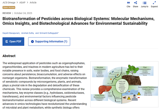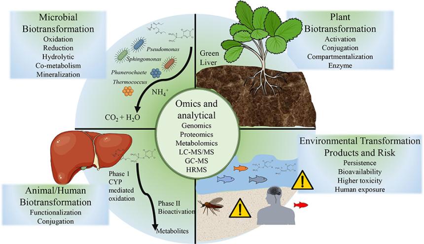 Image: Biotransformation of Pesticides across Biological Systems: Molecular Mechanisms, Omics Insights, and Biotechnological Advances for Environmental Sustainability This review provides a comprehensive overview of how pesticides are transformed across diverse biological and environmental systems, from microbes and plants to soil and aquatic environments. It highlights the molecular mechanisms and omics-based insights that reveal how these transformations occur and explores emerging biotechnological approaches for promoting environmental sustainability through pesticide bioremediation. This work is an important contribution to the fields of geomicrobiology and GeoHealth, stating how microbial and geochemical interactions influence contaminant fate, ecosystem integrity, and overall human and environmental health. Authors: Gayatri Basapuram1, Srimanti Duttagupta1, Avishek Dutta1,2, 1-Department of Geology, University of Georgia, Athens, Georgia, USA 2-Savannah River Ecology Laboratory, University of Georgia, Aiken, South Carolina, USA Abstract The widespread application of pesticides such as organophosphates, organochlorides, and triazines in modern agriculture has led to their notable presence in soils, water bodies, and food chains, raising concerns about persistence, bioaccumulation, and adverse effects on nontarget organisms. Biotransformation, the enzymatic transformation of xenobiotic compounds by microorganisms, plants, and animals, plays a pivotal role in the degradation and detoxification of these chemicals. This review provides a comprehensive examination of the mechanisms, key enzyme classes (e.g., hydrolases, oxidoreductases, transferases), and environmental factors influencing pesticide biotransformation across different biological systems. Recent advances in omics technologies have revolutionized the understanding of microbial and plant metabolism, while synthetic biology offers opportunities for engineering enhanced degradation capabilities. The environmental fate of transformation products is also discussed, together with a critical analysis of challenges, unresolved questions, and future research directions, offering a holistic perspective on pesticide biotransformation as a key process for mitigating chemical pollution. Type of News/Audience: Department News Read More: ACS Publications