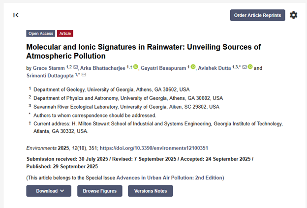 Image: Environments: "Molecular and Ionic Signatures in Rainwater: Unveiling Sources of Atmospheric Pollution." Grace Stamm, a geology minor and the first author of this paper, led the study on molecular and ionic signatures in rainwater, unveiling sources of atmospheric pollution. Grace, her student assistantship, and another undergraduate, Arka Bhattacharjee (co-author), were supported through the NSF award (EAR: 2502654), Impact of Extreme Weather Events on Biogeochemical Cycling and Microbial Dynamics: Assessing Post-Hurricane Helene Shifts in the Oconee River Watershed. This study reveals that rainwater in semiurban Athens, Georgia, acts as a dynamic vehicle for both nutrient ions and a complex suite of organic contaminants, exposing hidden dimensions of atmospheric contamination. It shows that during extreme events, river water chemistry is shaped not only by stormwater runoff but also by the often-overlooked influence of atmospheric deposition. Authors: Grace Stamm1,2, Arka Bhattacharjee1, Gayatri Basapuram1, Avishek Dutta1,3, and Srimanti Duttagupta1 1 - Department of Geology, University of Georgia, Athens, GA 30602, USA; grace.stamm@uga.edu (G.S.) 2 - Department of Physics and Astronomy, University of Georgia, Athens, GA 30602, USA 3 - Savannah River Ecological Laboratory, University of Georgia, Aiken, SC 29802, USA Abstract Atmospheric deposition through rainfall plays a significant role in transporting various anthropogenic contaminants to terrestrial and aquatic ecosystems. However, rainwater’s integrated ionic and molecular composition remains underexplored in semiurban environments. This study provides a comprehensive chemical characterization of rainwater collected during seven precipitation events from February to April 2025 in Athens, Georgia, USA. This semiurban area is characterized by substantial vehicular traffic, seasonal agricultural activities, and ongoing construction, while lacking significant industrial emissions. Targeted spectrophotometric analyses revealed heightened concentrations of nitrate (ranging from 2.0 to 4.3 mg/L), sulfate (17 to 26 mg/L), and phosphate (2.4 to 3.1 mg/L), with peak concentrations observed during high-intensity rainfall events. These findings are consistent with enhanced wet scavenging of atmospheric emissions. Concurrently, both targeted and non-targeted gas chromatography-mass spectrometry (GC-MS) analyses identified a diverse array of organic pollutants in the rainwater, including organophosphate, organochlorine, and triazine pesticides; polycyclic aromatic hydrocarbons (PAHs); plasticizers; flame retardants; surfactant degradation products; and industrial additives such as bisphenol A, triclosan, and nicotine. Furthermore, several legacy contaminants, such as organochlorines, were detected alongside currently utilized compounds, including glyphosate and its metabolite aminomethylphosphonic acid (AMPA). The concurrent presence of elevated anion and organic pollutant levels during significant storm events suggests that atmospheric washout can be the primary deposition mechanism. These findings underscore the capability of semiurban atmospheres to accumulate and redistribute complex mixtures of pollutants through rainfall, even in the absence of large-scale industrial activity. The study emphasizes the importance of integrated ionic and molecular analyses for uncovering concealed pollution sources. It highlights the potential of rainwater chemistry as a diagnostic tool for monitoring atmospheric contamination in urbanizing environments. Keywords: rainwater chemistry; atmospheric deposition; non-targeted analysis; organic micropollutants; plasticizers Type of News/Audience: Department News Research Areas: Geomicrobiology GeoHealth Read More: Environments (MDPI)
